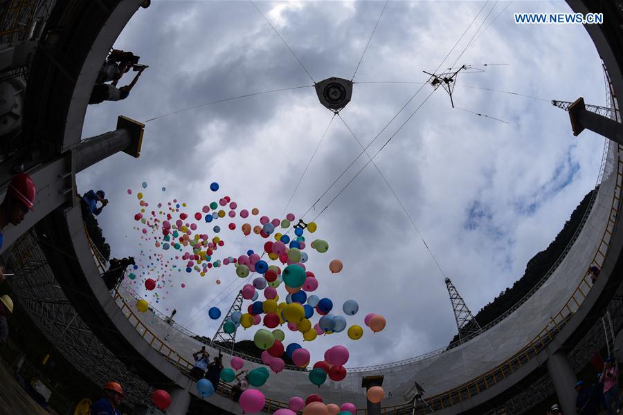 Balloons are released to celebrate the complete installation on the Five-hundred-meter Aperture Spherical Telescope (FAST) in Pingtang County, southwest China's Guizhou Province, July 3, 2016. Installation was completed on the world's largest radio telescope on Sunday morning as the last of 4,450 panels was fitted into the center of the big dish. Scientists will then begin debugging and trial observation of the FAST. (Xinhua/Ou Dongqu)