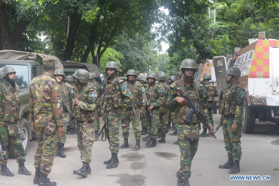 Bangladeshi army personnel stand guard during a rescue operation after an attack at a Spanish restaurant in Dhaka's diplomatic enclave Gulshan, Bangladesh, July 2, 2016. Gunmen killed 20 foreigners soon after they stormed a Spanish restaurant in Dhaka in Bangladesh's worst hostage crisis, a spokesman of the Bangladesh Army said on Saturday. (Xinhua/Shariful Islam)