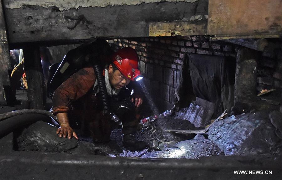 A rescuer works at the site of a coal mine in which a fire broke out in Benxi City, northeast China's Liaoning Province, July 5, 2016. The mine in Benxi City caught fire early on Monday morning and has trapped 13 people underground. A total of 150 rescuers have been dispatched. Rescuers have been close to the ignition point by 1:00 p.m. Tuesday. (Xinhua/Yang Qing)