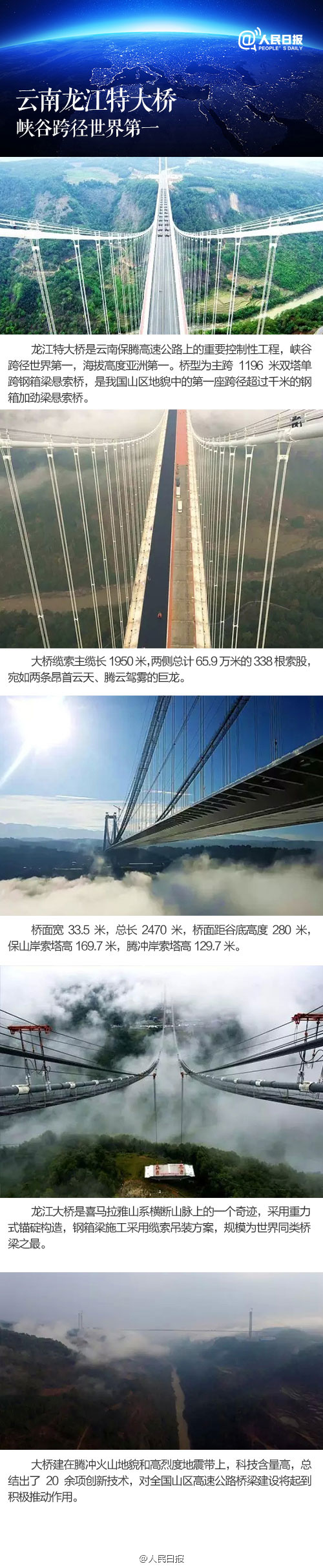 Linking the cities of Baoshan and Tengchong, the bridge boasts a length of over 2,470 meters and a height of 280 meters. It cost 1.9 billion yuan (over $300 million) to bring the bridge into existence. The bridge will become a juncture between Yunnan province and India via Myanmar.