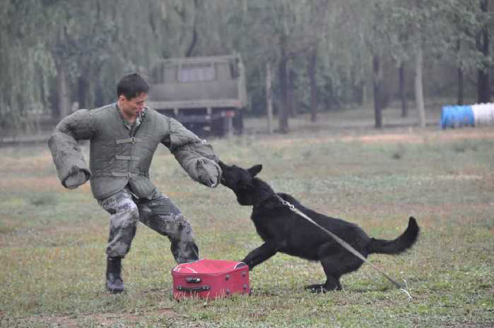 File photo shows Langya, a military working dog, bites into a specially designed protection sleeve worn by Staff Sergeant Wang Yongwei. Seven MWD handlers from the MWD training base under the PLA Army carried out a training exercise with their dogs recently in preparation for the International Military Working Dog Competition codenamed "Loyal Partner" to be held in Russia in late July. It will be the first time for the PLA to participate in such a competition. (ChinaMil/Zhang Tao)
