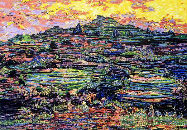 Originating from the region of Pu’er during the 1980s, the block printing woodcut is a new technique for printmaking. All color plates of a picture is concentrated on one plate, and the mode of creation is adopted, with which a picture is carved while being printed, and diminished plate by plate. The process of printmaking is a process that a print is destroyed naturally without reversal. It is usually called out-of-print mimeographed chromatographic woodblock print that is different from traditional plate-distributed chromatography.
