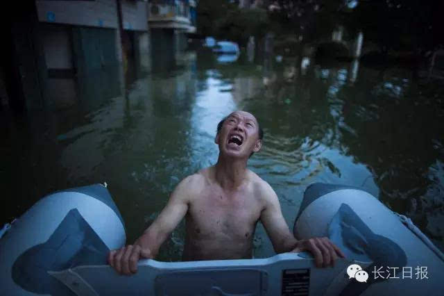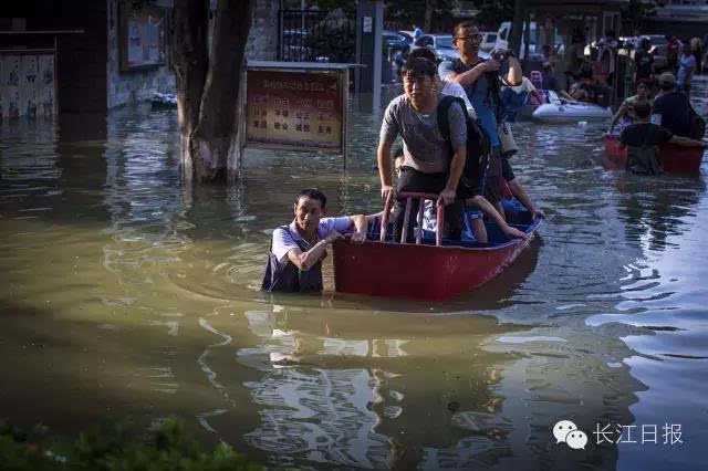 Zhang Shaoming, 67, is a security guard in the community. For the past few days, from 6 a.m. to 6 p.m., Zhang has been using a rubber boat to shuttle residents around the compound. In order to make room for more seats, as well as to oversee the safety of his passengers, Zhang himself remains in the water and pushes the boat forward with his hands. The water reaches to above his waist at all times, and sometimes even over his head in the deepest areas.