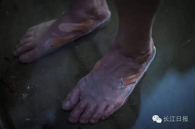 Injured feet, hurt from shuttling residents through the water. (Photo/Changjiang Daily)