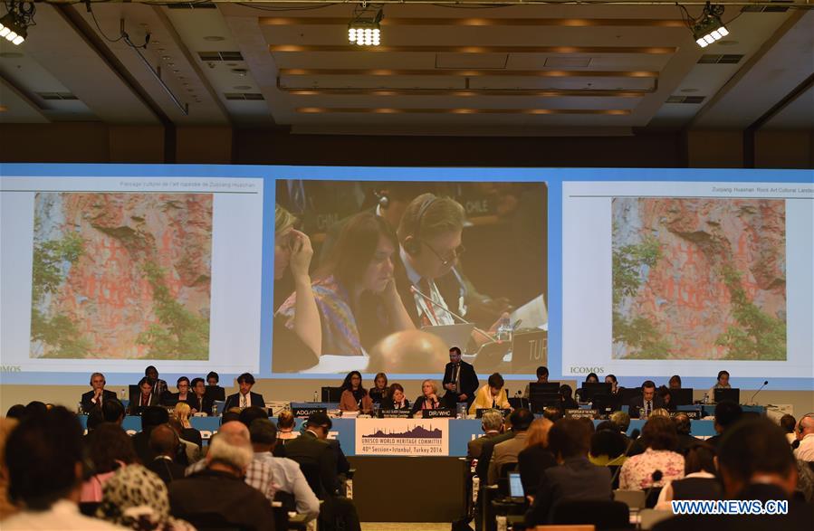 Representatives discuss during the evaluation of China's Zuojiang Huashan rock-art cultural landscape at the 40th session of World Heritage Committee held in Istanbul, Turkey, July 15, 2016. China's Zuojiang Huashan rock-art cultural landscape was added to the World Heritage List here on Friday. [Photo: Xinhua]