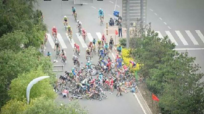 A mass crash happens on the 1st day of Tour de Qinghai Lake 2016 (??TDQL2016?) in northwest China on Sunday as a man dashed himself into cycling athletes.