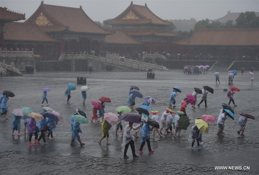 Tourists visit the Forbidden City in rain in Beijing, capital of China, July 20, 2016. Beijing's meteorological bureau issued an orange alert for rainstorm Wednesday noon. (Xinhua/Luo Xiaoguang)