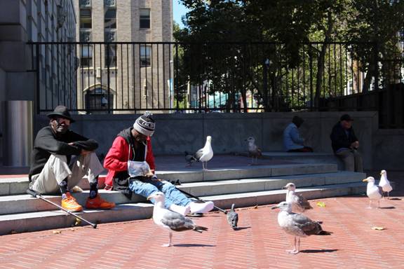 Jacob (Left), who prefers people to call him “Stack”, is enjoying the sunshine with his friend. After being a construction worker for 25 years, “Stack” moved from New York City to San Francisco 15 years ago because of “the weather”. “I tend to stay away from the shelters,” he said, “It’s like prisons. There’re bedbugs and…I heard that two guys were murdered in a shelter here. People steal your stuff and fight. It’s safer to sleep on the streets. There’re more eyes here.”