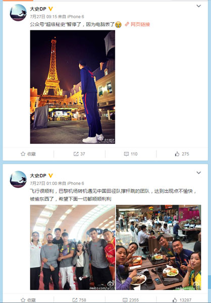 Screenshot of Chinese track athlete Shi Dapeng's weibo account. [Photo: CRIENGLISH.com]