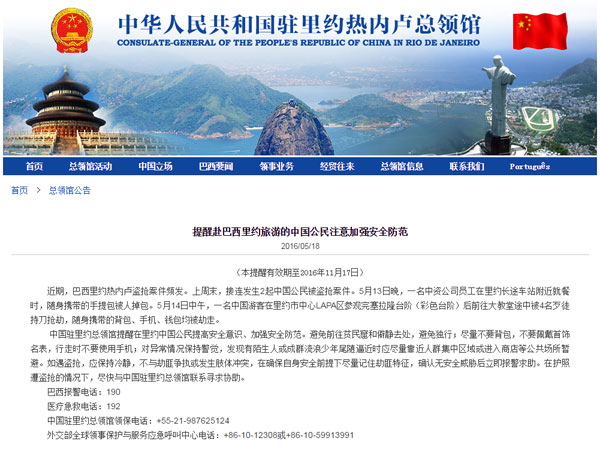 Chinese consulate-general in Rio de Janeiro publishes a safety warning on its official website, reminding Chinese nationals to be cautious while traveling in Brazil. [Photo: CRIENGLISH.com]