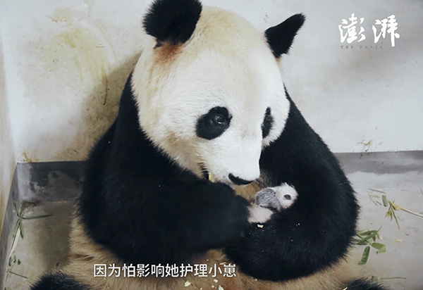 After the cub was born, Guo Guo held her almost 24 hours a day. Indeed, in the monitor room, the reporter observed Guo Guo holding the cub close to her chest. When the cub turned around, it stretched its limbs, looking especially adorable. The cub's eyes have not yet opened. Zookeepers are monitoring the mother and daughter around the clock using a high-definition surveillance system, logging their conditions every hour. A physical check on July 29 showed that the cub weighed 893.4 grams and was 29 centimeters long. These numbers are both above average for a panda cub.