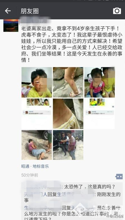After Liu found out that his ex-wife had a hotel booking record in June, one month after the couple divorced, he drank a lot and started beating his own kids heartlessly and severely, leaving their bodies bruises and cuts all over. He then took pictures of the kids and posted online, immediately drawing huge attention. Many were furious about his conduct but none of them reported Liu to the police for fear of the two kids would be left unattended, while Liu’s ex-wife’s whereabouts remains unclear.