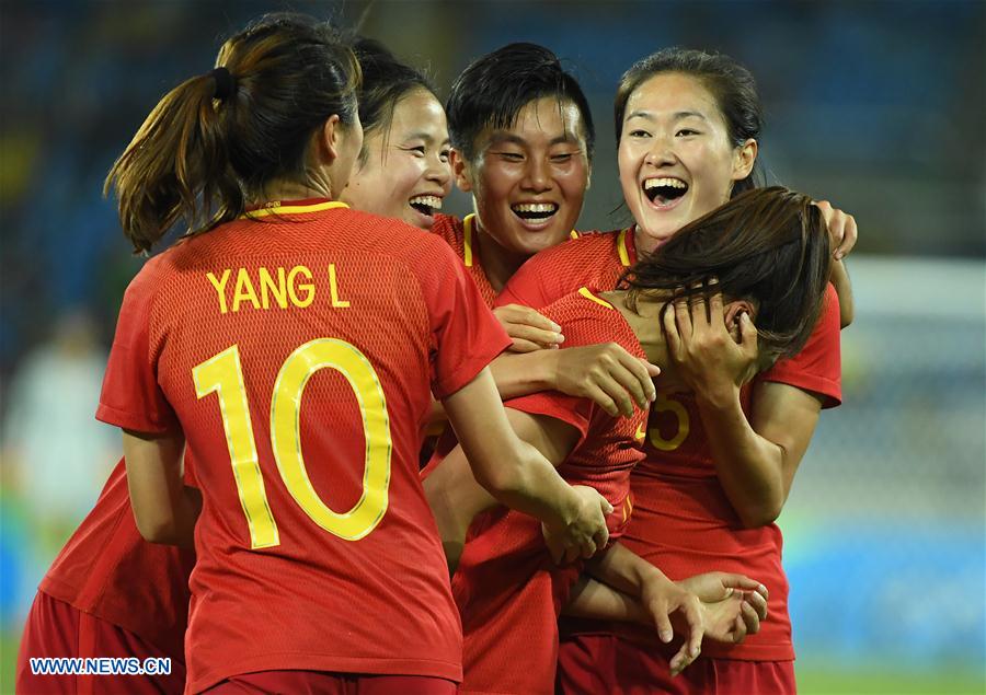 Players of China celebrate for a goal during a Group E match of women's football at the 2016 Rio Olympic Games in Rio de Janeiro, Brazil, on Aug. 6, 2016. China defeated South Africa 2-0. (Xinhua/Lui Siu Wai)