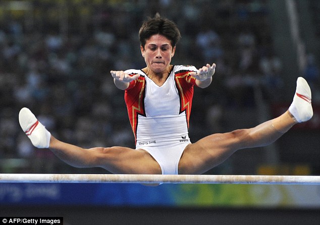 The age-defying gymnast takes to the uneven bars during qualification at the Beijing Olympics in 2008 for Germany