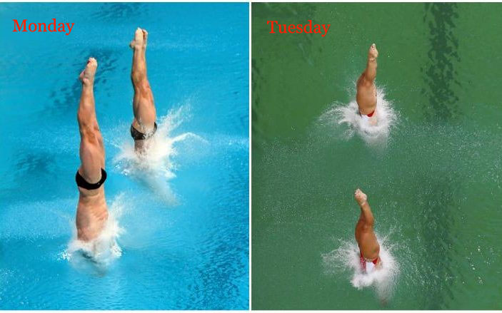 A photo combo shows the comparison of blue and green water in the diving events at the Rio Olympics. [Photo: huanqiu.com]