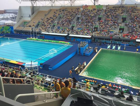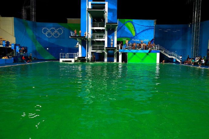 Photo taken on August 9, 2016 shows the green water in the diving pool of the Rio Olympic Games. [Photo: sohu.com]