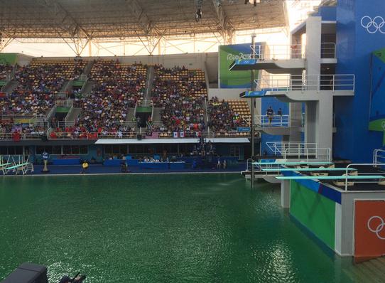 Photo taken on August 9, 2016 shows the green water in the diving pool of the Rio Olympic Games. [Photo: huanqiu.com]
