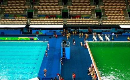 The green water in the diving pool of the Maria Lenk Aquatics Center in Rio. (Photo/Xinhua)