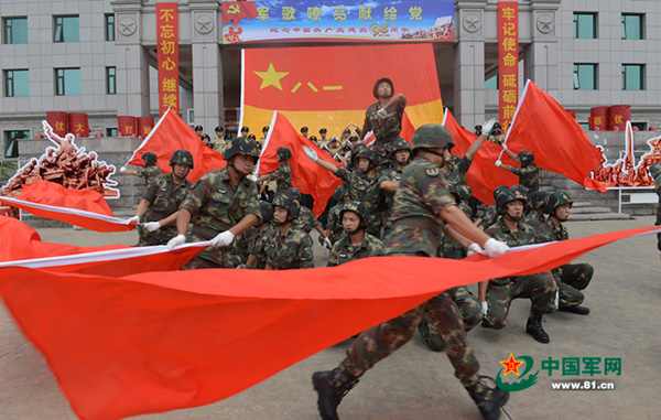 The upper part of the flag features a red background. There is a five-pointed star on the left side, along with the Chinese numerals for “8” and “1,” which symbolize Army Day. The bottom of the flag has a yellow strip to represent fire shooting from a soaring rocket.