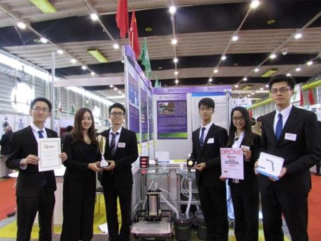 The R&D team show their "air hand-washing device" at the 44th Geneva International Exhibition of Inventions in April 2016.