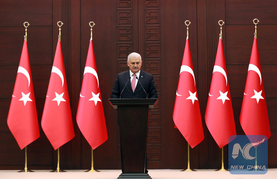 Turkish Prime Minister Binali Yildirim delivers a speech during a press conference after a Turkish-Israeli meeting, at the Cankaya Palace in Ankara, on June 27, 2016. (AFP/Xinhua)