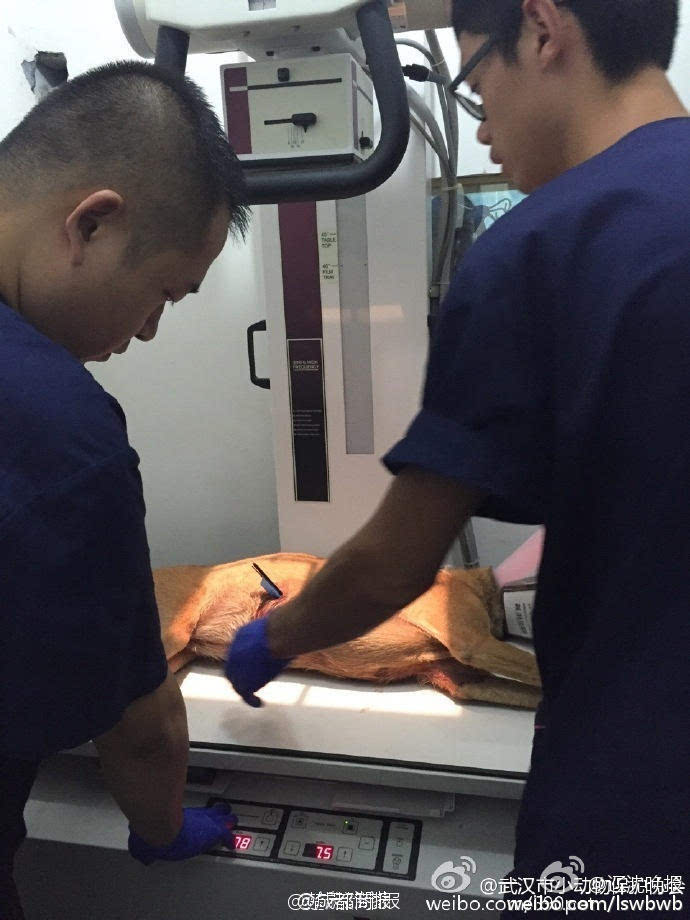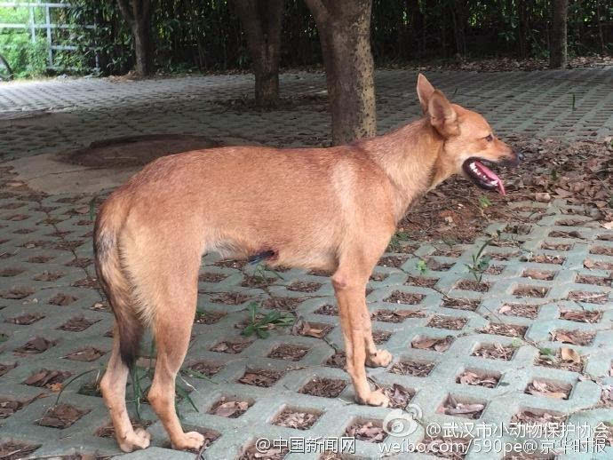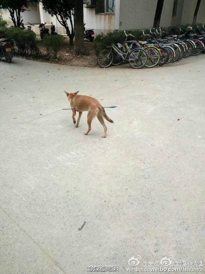 A stray dog pierced by arrow was recently spotted on the campus of Huazhong University of Science and Technology in Wuhan, Hubei province. Members of a local animal protection organization managed to catch the dog and bring it to an animal hospital. They are now looking for the person who shot the arrow.