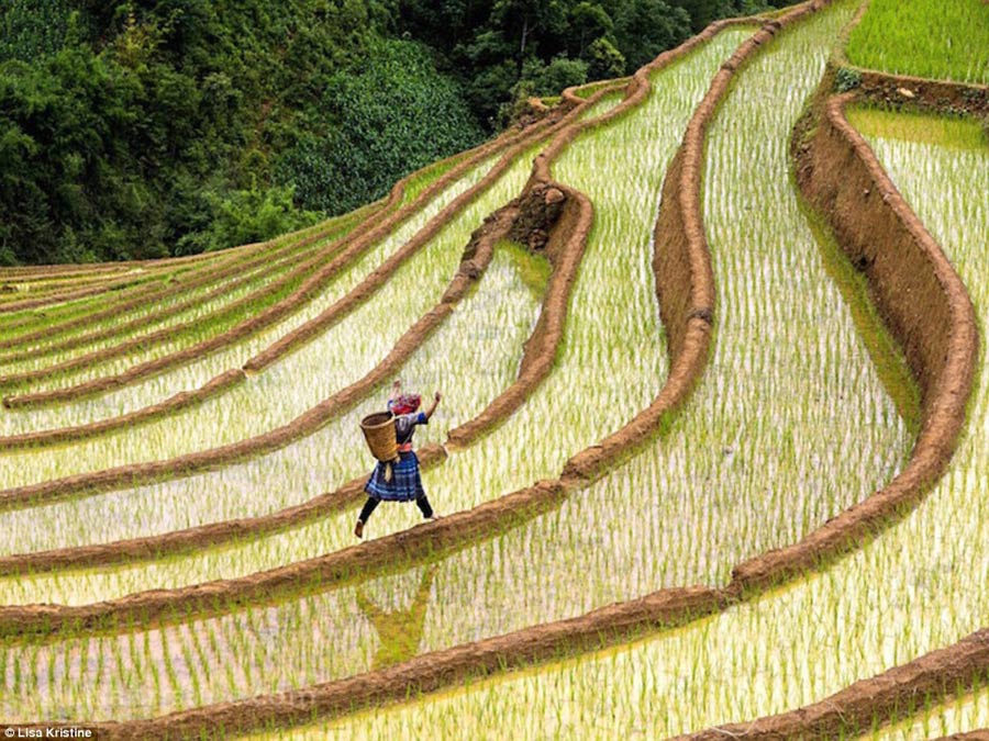 A woman leaps along the walls of a Vietnamese paddy field. The basket on her back is to carry the rice stems that she picks.