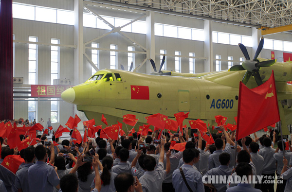 An AG600 massive amphibious aircraft, world's largest of its kind, rolls off a production line in Zhuhai, Guangdong province, on July 23, 2016. [Photo/Chinadaily.com.cn]