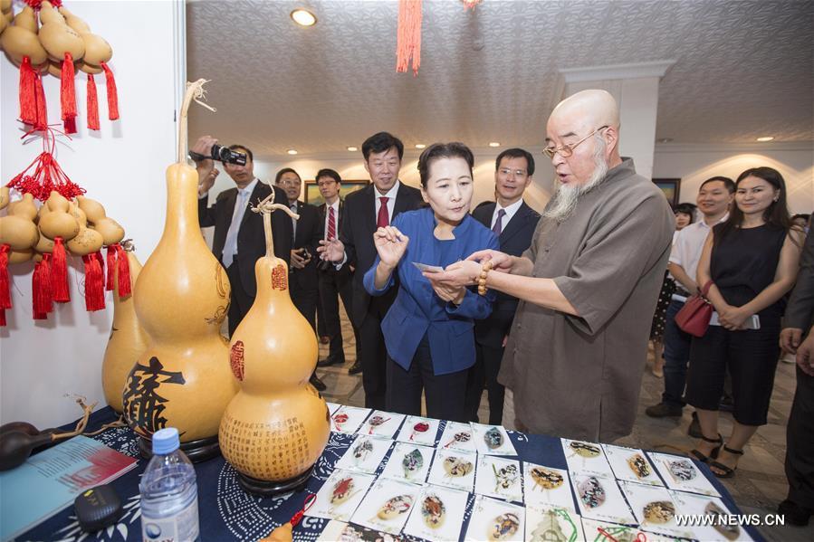 Cui Yuying (L, front), deputy director of China's State Council Information Office, talks with a Chinese folk artist during China Intangible Cultural Heritage Exhibition in Almaty, Kazakhstan, Aug. 26, 2016. A series of "Feel China in Kazakhstan" cultural activities kicked off on Friday in the Kazakh capital of Astana and its largest city of Almaty. (Xinhua/Pavel Mikheev)