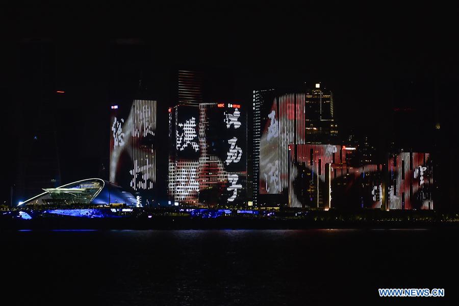 Photo taken on Aug. 29, 2016 shows a light show on buildings by the Qiantang River in Hangzhou, capital of east China's Zhejiang Province. The light show is prepared for the 11th G20 summit, which will be held from Sept. 4 to 5 in Hangzhou. (Xinhua/Huang Zongzhi)
