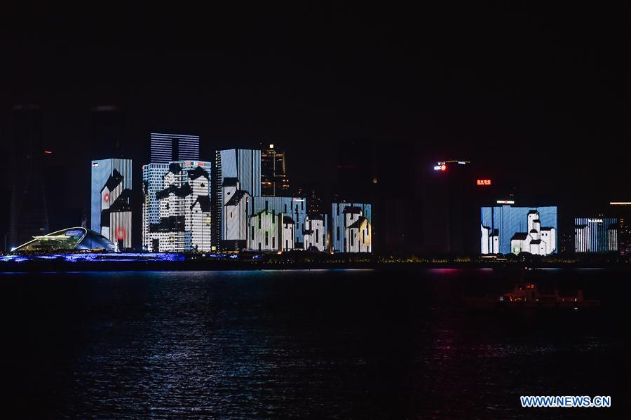 Photo taken on Aug. 29, 2016 shows a light show on buildings by the Qiantang River in Hangzhou, capital of east China's Zhejiang Province. The light show is prepared for the 11th G20 summit, which will be held from Sept. 4 to 5 in Hangzhou. (Xinhua/Huang Zongzhi)