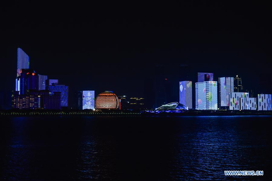 Photo taken on Aug. 29, 2016 shows a light show on buildings by the Qiantang River in Hangzhou, capital of east China's Zhejiang Province. The light show is prepared for the 11th G20 summit, which will be held from Sept. 4 to 5 in Hangzhou. (Xinhua/Huang Zongzhi)