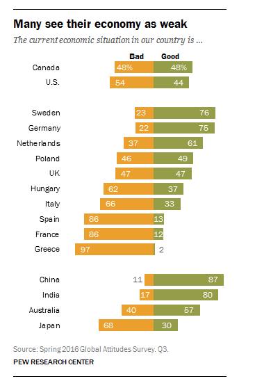 The relative calm we see in China may be uneasy, but it is not fleeting. China’s economy has stabilized, and is still growing at a decent pace. A recent Pew Research Center survey on national economies supports such optimism. The survey finds that close to 90 percent of Chinese view the current economic situation in their country as good, the highest of all countries surveyed. In comparison, the same survey finds that more than half of all Americans view the U.S. economy as weak.