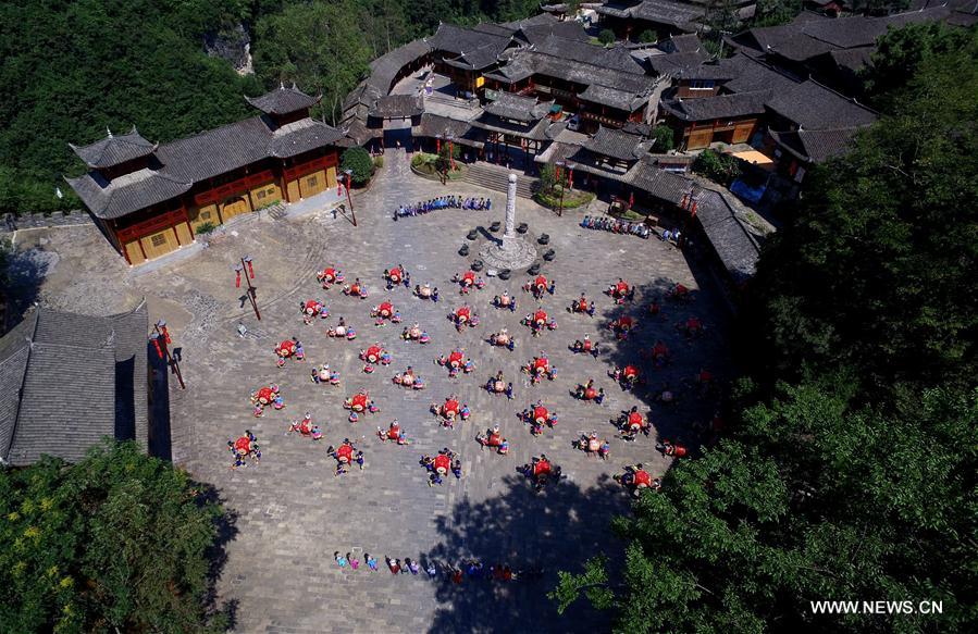 TONGREN, Sept. 3, 2016 -- People of the Miao ethnic group play drums to celebrate autumn harvest in Songtao Miao Ethic Autonomous County, southwest China's Guizhou Province, Sep. 2, 2016. (Xinhua/Long Rong)