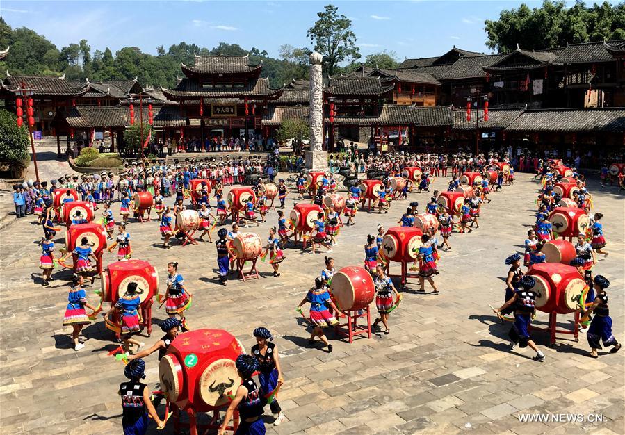 People of the Miao ethnic group play drums to celebrate autumn harvest in Songtao Miao Ethic Autonomous County, southwest China's Guizhou Province, Sep. 2, 2016. (Xinhua/Long Rong)