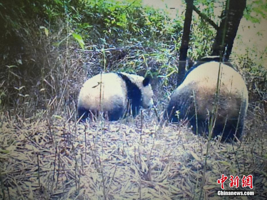An adult panda and its cub were recorded by a hidden camera in China's Qianfoshan Nature Reserve on Aug. 3. This is the first time wild pandas have been caught on camera in this reserve, which is located in Sichuan province. With the increase of the animal's population in the wild, the animal has been officially downgraded from “endangered” to “vulnerable” on the Red List maintained by the International Union for Conservation of Nature. (Photo provided by the Mianyang Forestry Bureau)