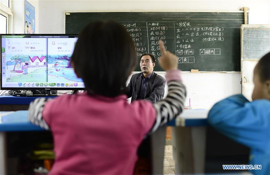 The 56-year-old teacher Hua Fulin (rear), the only teacher of the small school in Kunlun Village, instructs his students in Kunlun Village of Haidong City, northwest China's Qinghai Province, Sept. 8, 2016. About 50 kilometers away from the nearest county, the Kunlun small school now has only eight students and one teacher. (Xinhua/Zhang Hongxiang)