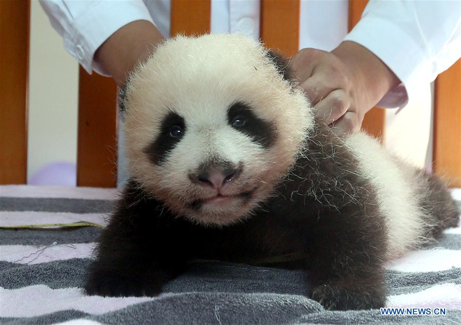 A giant panda cub gets her chest measured in Shanghai, east China, Sept. 9, 2016. The two-month-old female giant panda was named Peanut Friday. (Xinhua/Fan Jun)