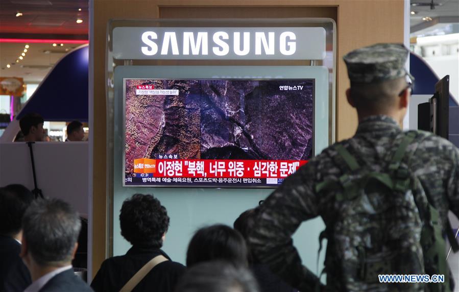 People watch a TV broadcasting a suspected nuclear test held by Democratic People's Republic of Korea, at a train station in Seoul, South Korea, Sept. 9, 2016. South Korea's military believed the Democratic People's Republic of Korea (DPRK) might have conducted the "most powerful" nuclear test so far on Friday after an artificial earthquake was detected at a site where its fourth nuclear test was carried out earlier this year. (Xinhua/Yao Qilin)