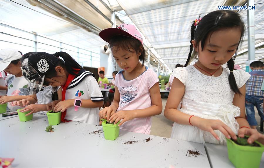 Children try planting at an agricultural demonstration base in Qingdao, east China's Shandong Province, Sept. 9, 2016. Children in the Guangrao Road Primary School were given a class at an agricultural demonstration base in Qingdao on Friday. (Xinhua/Liang Xiaopeng)