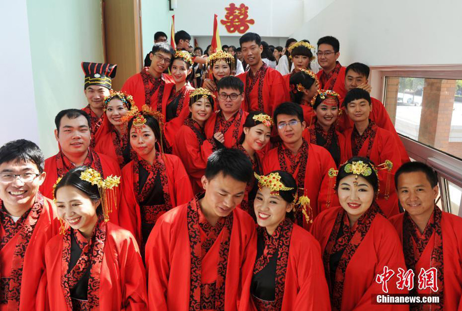 To promote green weddings and traditional Chinese culture, Shimen experimental school in Shijiazhuang, north China's Hebei province, held a collective wedding for 12 newlyweds on Teachers' Day, September 10, 2016. The couples wore the traditional Hanfu dress and consisted of at least one teacher from the school. [Photo: Chinanews.com]