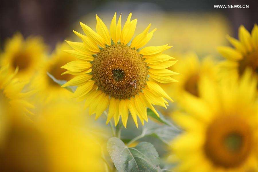 A bee lands on a sunflower at a park in Heping District in Shenyang, capital of northeast China's Liaoning Province, Sept. 12, 2016. (Xinhua/Yang Qing)