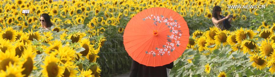 Tourists enjoy themselves amid sunflowers at a park in Heping District in Shenyang, capital of northeast China's Liaoning Province, Sept. 12, 2016. (Xinhua/Ding Hongfa)