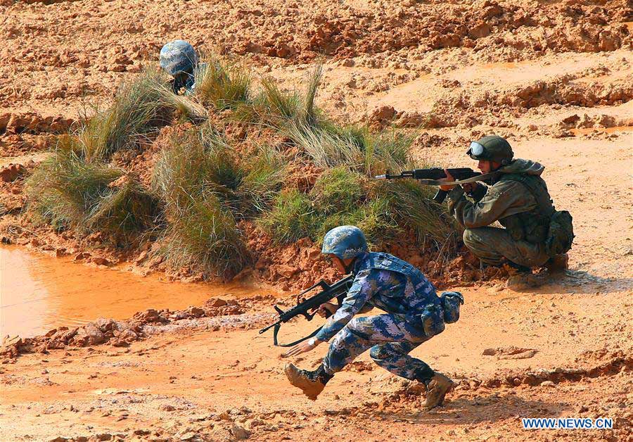 Chinese and Russian marines take part in a joint naval drill in Zhanjiang, south China's Guangdong Province, Sept. 14, 2016. China and Russia started "Joint Sea 2016" drill off Guangdong Province in the South China Sea on Tuesday. The drill will run until Sept. 19, featuring navy surface ships, submarines, fixed-wing aircraft, helicopters, marines and amphibious armored equipment. (Xinhua/Zha Chunming)