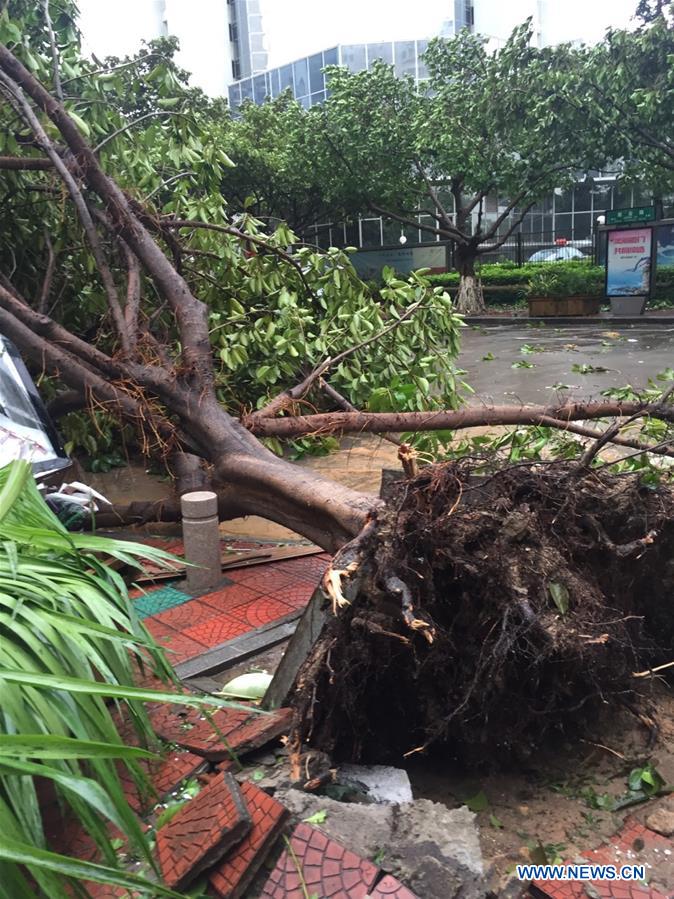 A tree is blown down by gale in typhoon-hit Xiamen City, southeast China's Fujian Province, Sept. 15, 2016. Typhoon Meranti made landfall in Xiamen in the early morning on Thursday. (Xinhua/Zheng Jun)