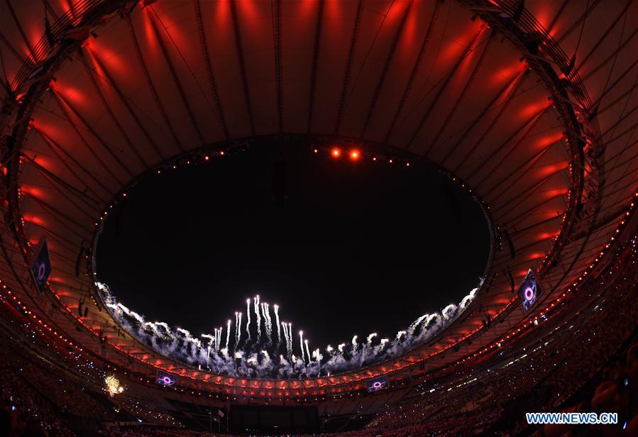 Photo taken on Sept. 18, 2016 shows the fireworks of the closing ceremony of Rio 2016 Paralympic Games at Maracana Stadium in Rio de Janeiro, Brazil. [Photo: Xinhua]