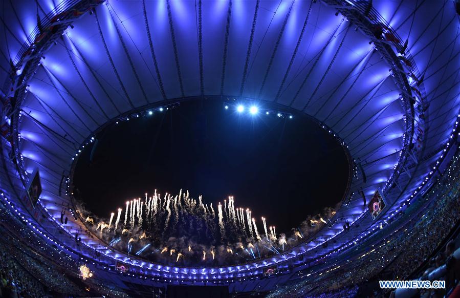 Photo taken on Sept. 18, 2016 shows the fireworks of the closing ceremony of Rio 2016 Paralympic Games at Maracana Stadium in Rio de Janeiro, Brazil. [Photo: Xinhua]