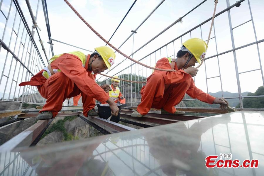 Chinese workers replace a scratched piece of glass with a new one on the glass-bottomed suspension bridge 180 meters above the ground at the Shiniuzhai National Geopark in Pingjiang county, Yueyang city, Central China's Hunan province, September 19, 2016.(Photo: China News Service/Yang Huafeng)