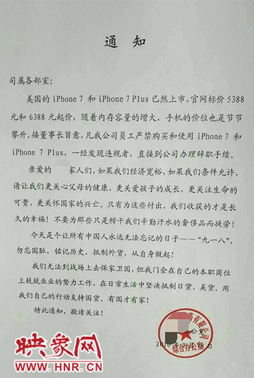 An employee from the company surnamed Liu told Hnr.cn that the notice was issued directly by the company’s chairman, who had read extreme stories about Chinese people being so desperate for iPhones that they traded their own organs for money to buy the phones. The chairman didn’t want his own employees to face such pressure. The chairman also hoped that the date of the announcement would stir up employees’ patriotism.
