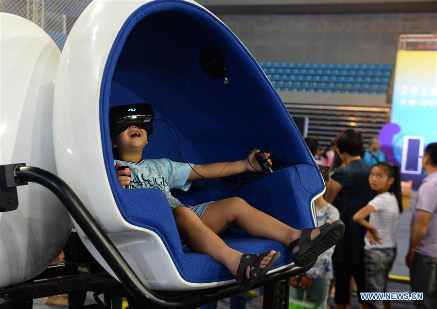 A boy experiences a VR game during a carnival in Liuzhou, south China's Guangxi Zhuang Autonomous Region, Oct. 1, 2016. People enjoy their first day of the week-long National Day holiday on Saturday. (Xinhua/Ren Pengfei)